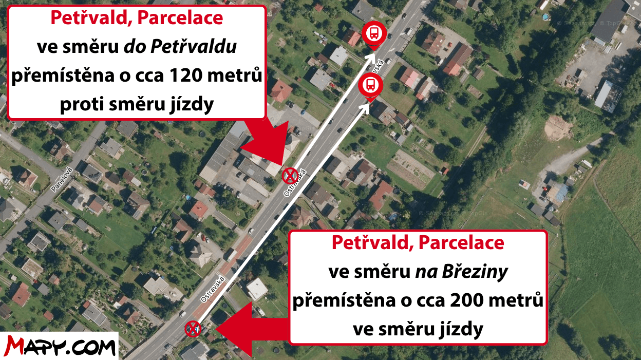 ve směru do Petřvaldu se dočasně přemisťuje o cca 120 m blíže (proti směru jízdy), k domu č. p. 708
