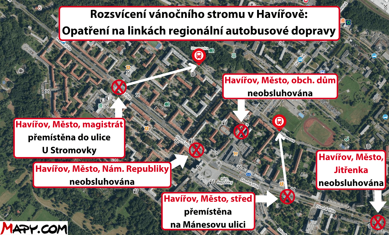 - pro linky 402, 406 a 413 ve směru Havířov, Podlesí, aut. nádr. přesunuta na ulici Na Nábřeží (u MŠ)