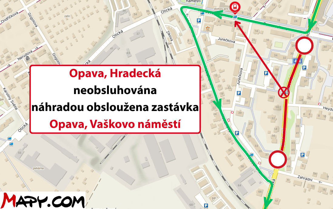 Z důvodu uzavírky Hradecké ulice v Opavě budou výše uvedené autobusové linky vedeny objízdnou trasou po Rooseveltově a Hobzíkově ulici.